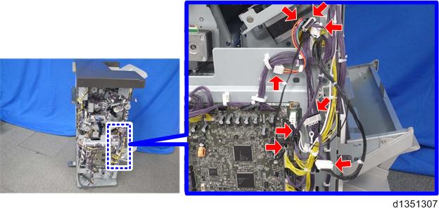 - Pull out the harnesses disconnected in step 11 to the right side of the finisher through the hole [A].