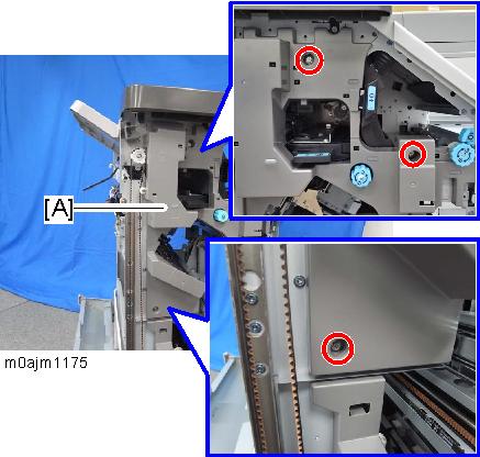 - Remove the pressure release motor bracket [A] from the rear side of the finisher (