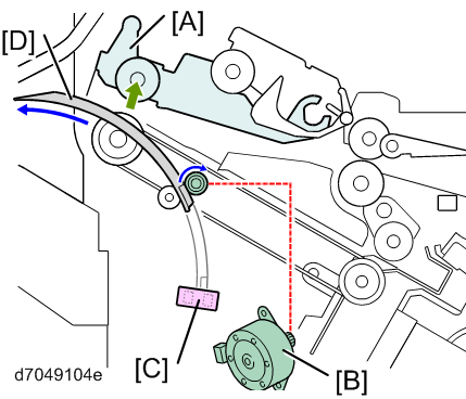 - The edge guide motor [B] drives to push the edge guide [D] out. The edge guide retreats into the machine when the last sheet of a job is output (the edge guide HP sensor [C] detects the edge guide).
