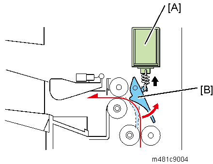 To deliver paper to a particular tray, the solenoid [A] for that tray opens the junction gate [B] to deliver the paper.