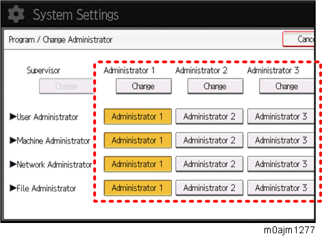 In the line for the administrator whose privileges you want to specify, press [Administrator 1], [Administrator 2], [Administrator 3] or [Administrator 4], and then press [Change].