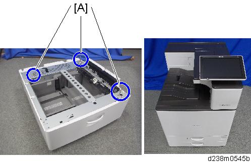 Holding the grips on the machine, align the machine with the locating pins [A], and place the machine on the paper feed unit.