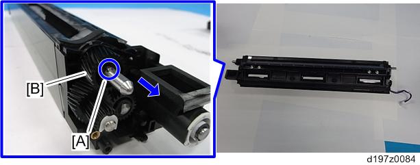- Remove the two development mixing auger bearings [A] (E-ring x1).